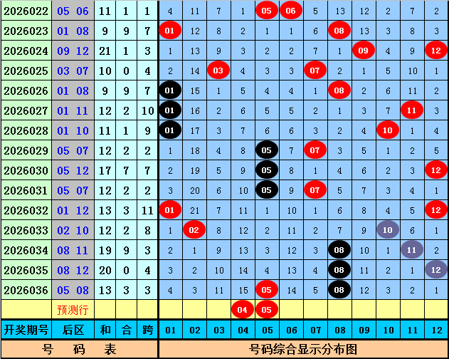 后分袂析:上期后区开出号码05和08,最近10期后区奖号奇偶比为11:9,大小比为12:8,本期后区看好号码01、04、05、11、12,后区单挑两码04、05。