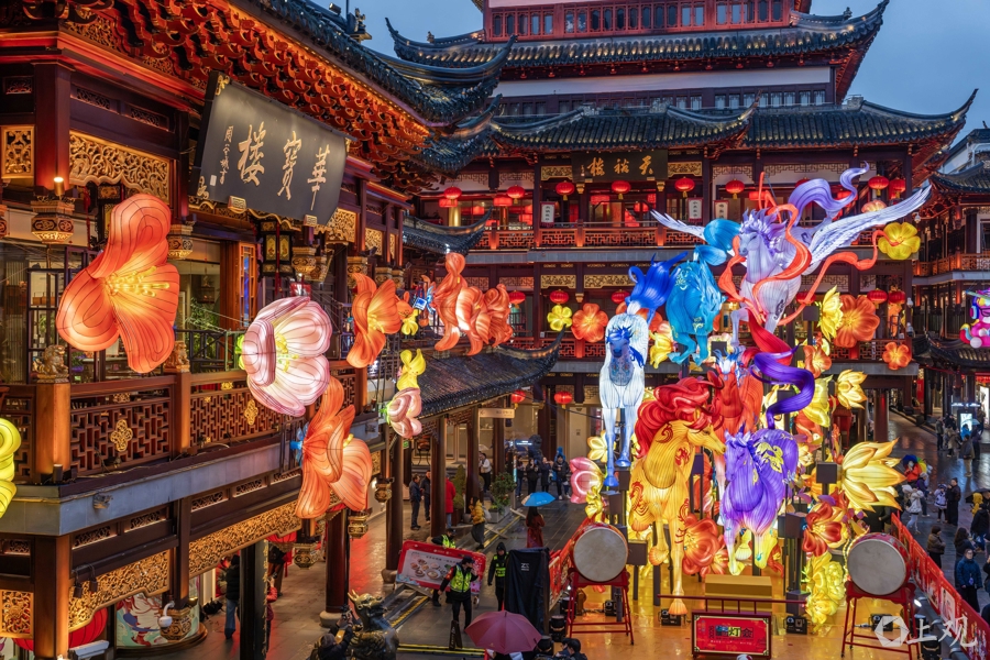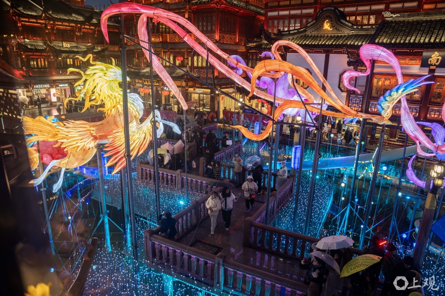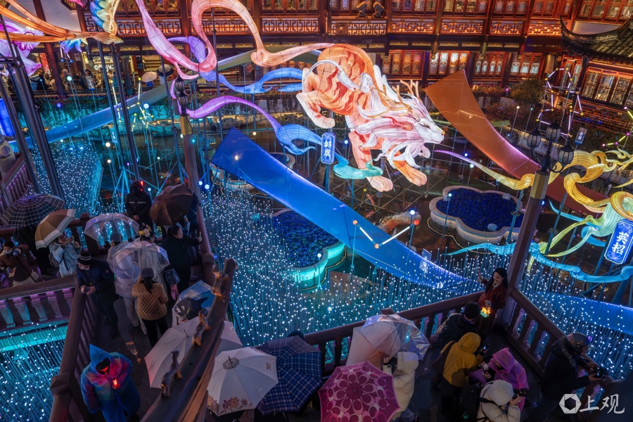 据介绍,除了主题灯组,豫园廊下、周边都挂了大量中国结和中国传统元素灯饰,加起来近万盏。