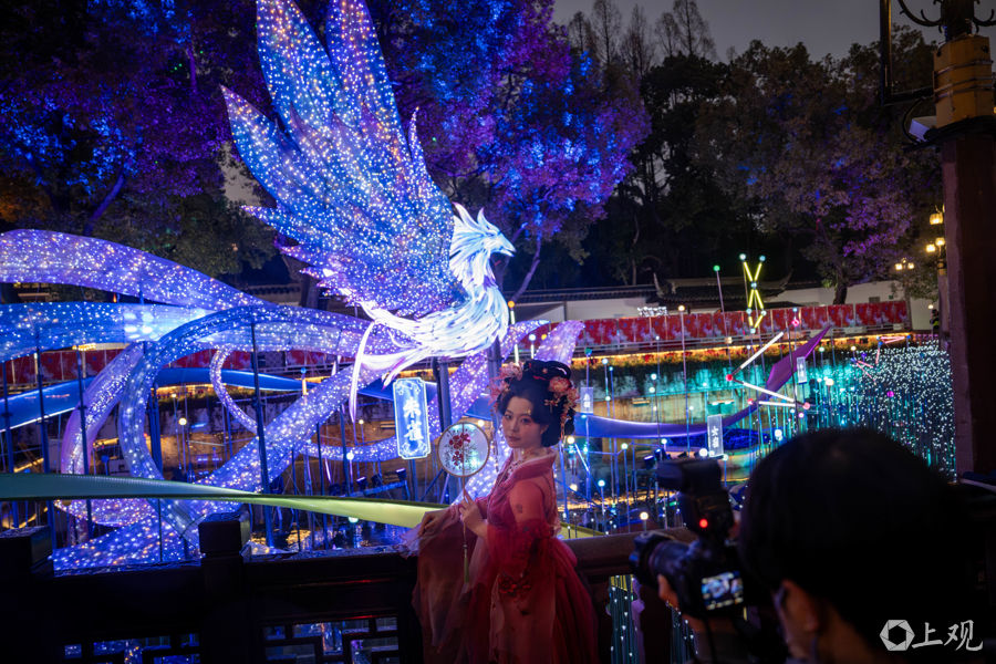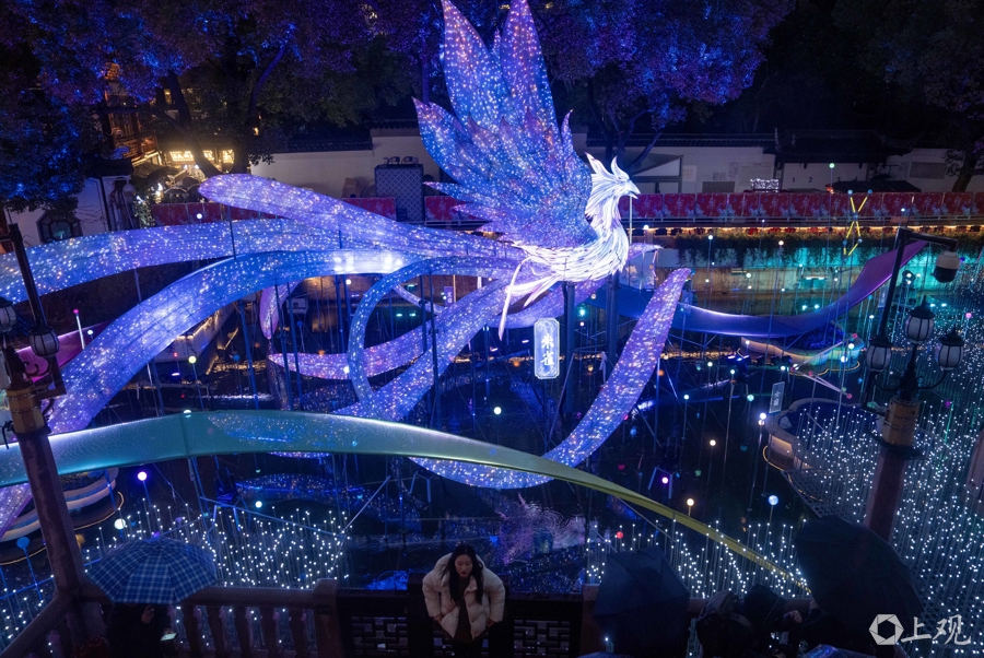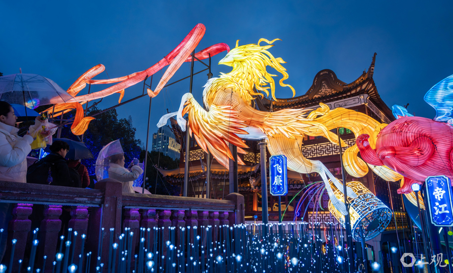 今年灯会特别设置了数字光影互动打破时空边界,在光影流转间沉浸式体验新春趣味。九曲桥每日定时上演「数字光影流光奇旅」,融合“二十八星宿”文化与“山海奇豫记”IP,以瑞兽朱雀为核心,演绎星宿神话。