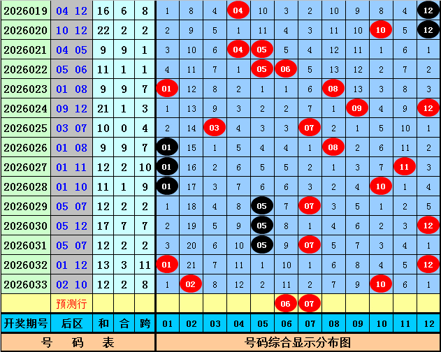 后区上期开出奖号02和10,该组合历史上出现了49次,其下期奖号频次辨认为:号码04、06、07、11出现10次,01、09出现9次,03出现8次,02、08出现7次,10、12出现6次,05出现4次,本期后区参考号码03、06、07、12,精选两码06和07。