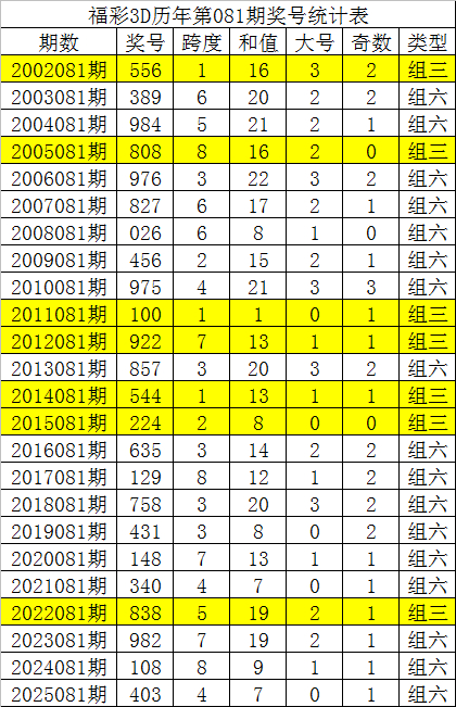 福彩3D积年第081期同期分辨开出奖号:556、389、984、808、976、827、026、456、975、100、922、857、544、224、635、129、758、431、148、340、838、982、108、403,谨慎统计见下表: