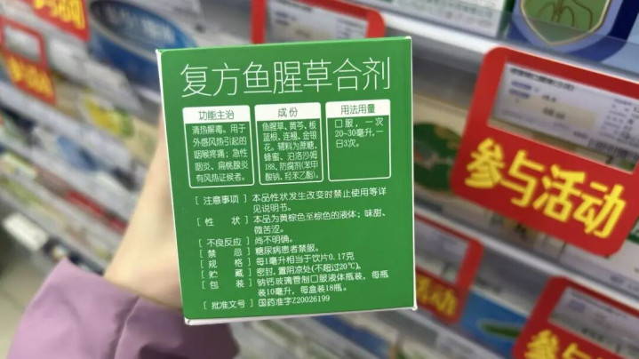 康恩贝生产的复方鱼腥草合剂的外包装上,[注意事项]显示为“详见说明书”,[禁忌]为“糖尿病患者禁服”,但[不良反应]显示为“尚不明确”。
