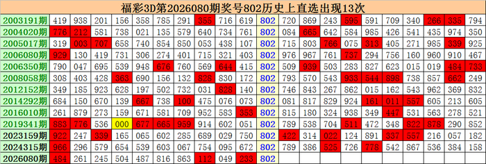 上期追思:福彩3D第2026080期开出奖号802。