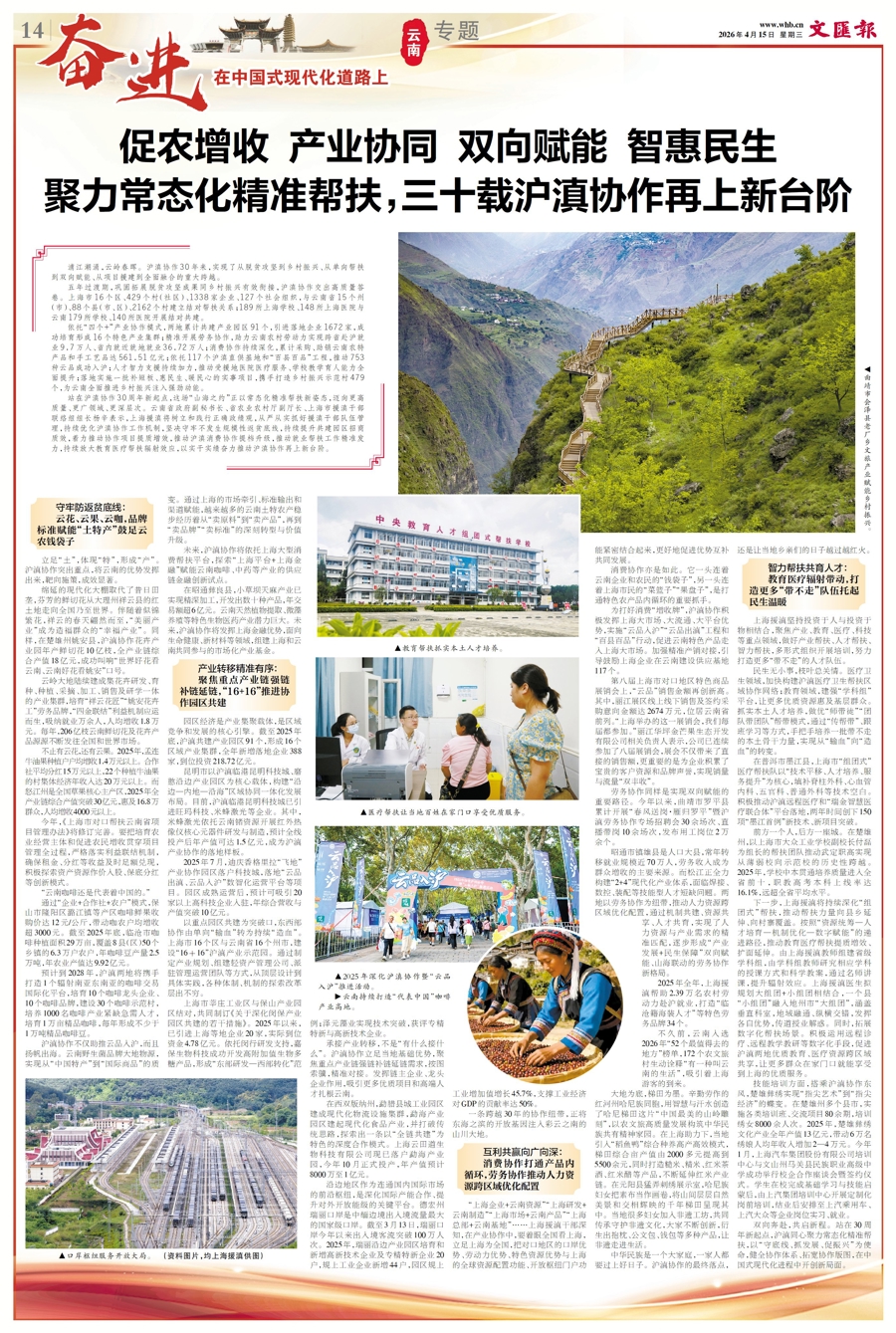 依托“四个+”产业合作模式,两地累计共建产业园区91个,引进落地企业1672家,奏效培育酿成16个特质产业集群;精确开展劳务合作,助力云南农村劳能源实现跨省赴沪工作9.7万东说念主、省内就近赶紧工作36.72万东说念主;残害合作连接深化,累计采购、助销云南农特居品和手工艺品达561.51亿元;依托117个沪滇直供基地和“百县百品”工程,推动753种云品奏效入沪;东说念主才智商营救连接加力,推动受援地病院医疗服务、学校教育育东说念主才调全面汲引;落地实践一批补短板、惠民生、暖民意的实事形貌,联袂打造乡村振兴示范村479个,为云南全面鼓动乡村振兴注入壮健动能。