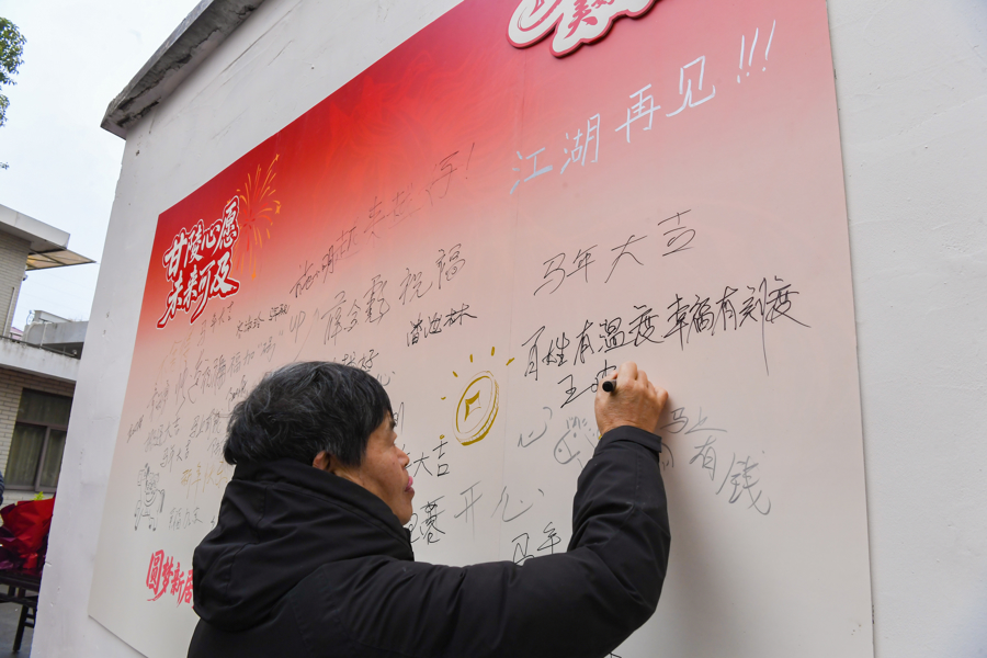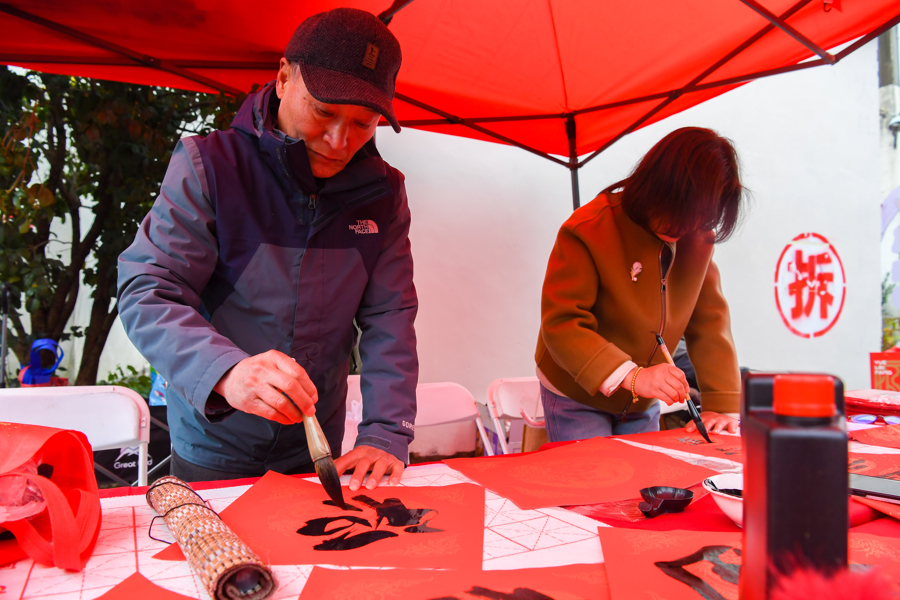 今天上午小区主通道两侧还设立五个便民服务与文化体验摊位,分别为:书写春联、撰写福字、绘制糖画、裁剪窗花、展示老物件。现场还设两处主题背景板,供居民打卡留念,珍藏社区记忆。