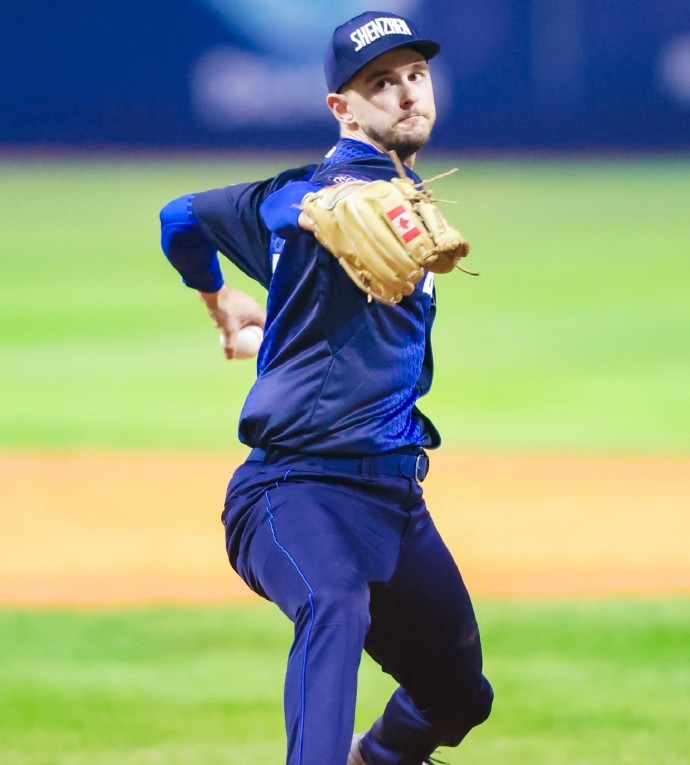 身材高大的宫海成,在上海正大龙队交锋深圳蓝袜队的第一场比赛中,展现出超越年龄的沉稳和冷静。这名 28 岁的上海本土选手毕业于棒球传统名校上海高东小学,早在 2017 年就以中国国家队最年轻成员身份出战 WBC 世界棒球经典赛,大赛的历练造就了强大的心理素质。第八、第九局,比分落后的深圳蓝袜队发起强力反扑,但宫海成作为上海正大龙队的投手登场后,近乎百发百中稳定输出,接连把对手三振出局,展现出一名顶级投手的素质。